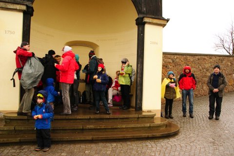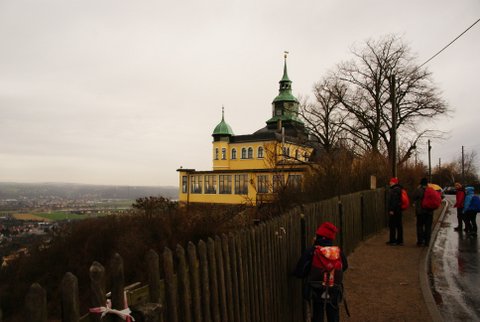 Mit neuen Kräften ging es anschließend weiter durch den Lößnitzgrund bis zum Spitzhaus hinauf. Da es wieder einmal regnete, stopften wir uns alle unter den Pavillon oberhalb der Spitzhaustreppe und nahmen unser Mittag zu uns. Hier fand auch endlich Nele ihr Lächeln wieder, als sie stolz mir ihren Wiener entgegenstreckte ;). Von unserem Reiseleiter bekamen wir eine kleine Weinverkostung, leider nur die kalte Variante…aus irgendeinem Grund hatte Ho Kocher und Glühwein erfolgreich zu Hause gelassen, aber wie schon mal erwähnt die Wetterprognose war eine andere gewesen.
