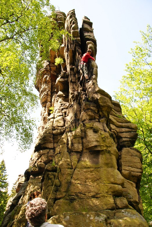 Am Sonntagfrüh hieß es erst mal Zelte abbauen und alles wieder in die Autos verstauen. Um 11 Uhr trafen wir uns. um endlich in den Greifensteinen zu klettern.Die Greifensteine sind für uns Sandsteinkletterer etwas