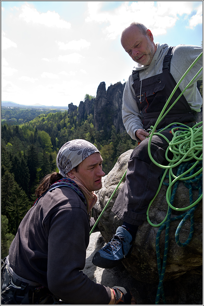 Vor uns war eine Seilschaft um Ralf Resack schon am Klettern. Motiv: 100 Jahre AW. Auf Bitten reichte man uns ein Seil von oben und so durften wir an der ersten Seilschaft des Tages mit teilnehmen.