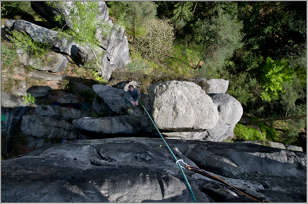 Zumindest den Kletteraktiven Mitgliedern unseres Klubs war aber klar, daß wir heuer aus nostalgischen Gründen den Gipfel aufsuchen werden. Und so trafen sich Wolfram, Peter und als Sympathisanten Georg mit Peggy und Kent. Auch wenn das Gelände etwas Kinderunfreundlich ist, die lieben Kleinen waren bei Georg und Kent dabei. Treffen wollten wir uns 10 Uhr am Gipfel und dies hat auch gut geklappt. Der Wehlgrund war unten noch etwas feucht vom Vortag, und sandig wie seit 1000 Jahren.